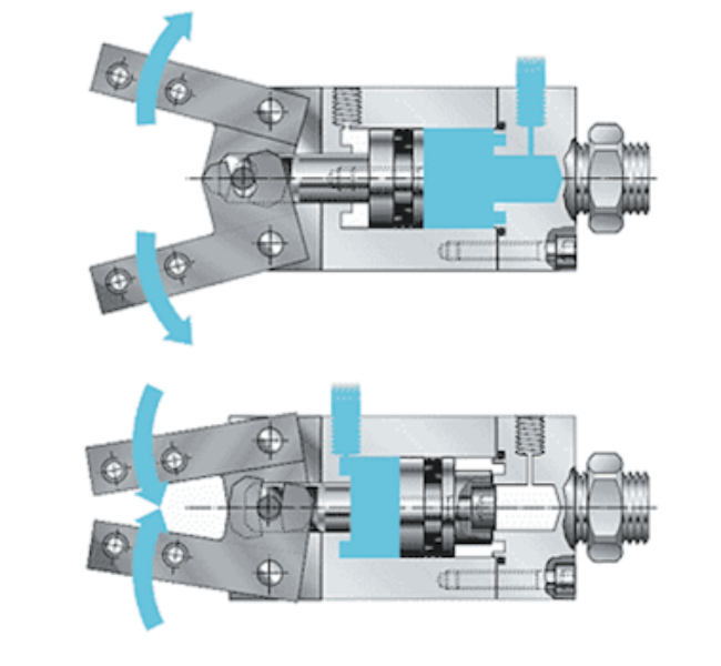 Pneumatic grippers rely on pistons and compressed air to offer exceptionally strong lifting and gripping actions for heavy items that cannot be moved by electric grippers. When triggered by the force of compressed air, these grippers grasp, lift, or move the item, and then release the item when the flow of compressed air decreases or stops.